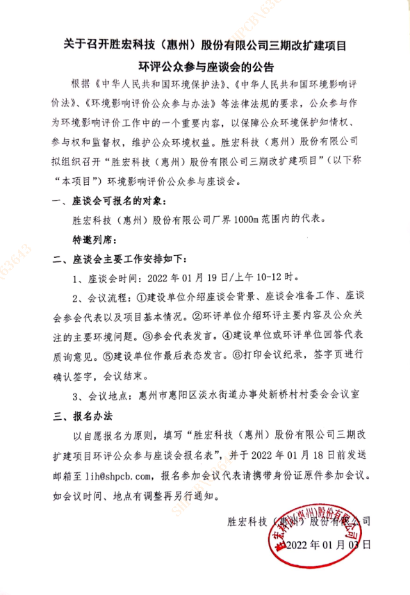 關(guān)于召開(kāi)勝宏科技(惠州)股份有限公司三期改擴(kuò)建項(xiàng)目環(huán)評(píng)公眾參與座談會(huì)的公告